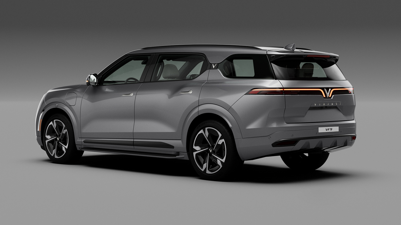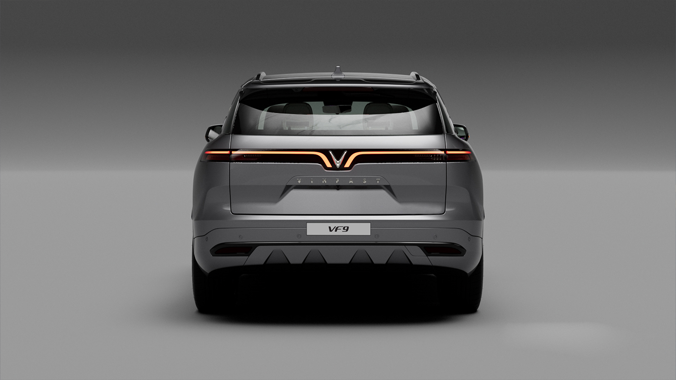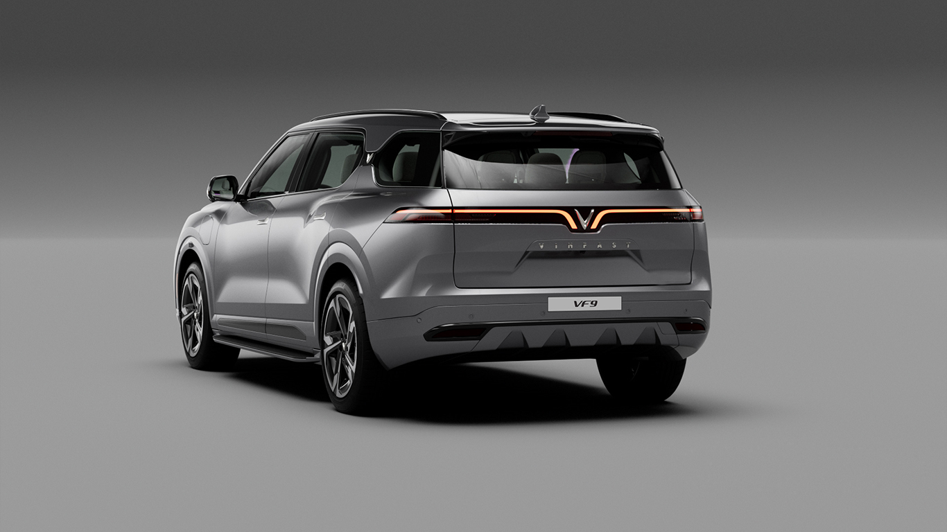 Điểm nổi bật ở ngoại hình VF 9 vẫn là dải đèn LED có logo chữ “V” lồng vào nhau ở đầu và đuôi xe tạo sự liên kết chặt chẽ và khát vọng vươn xa của VinFast.