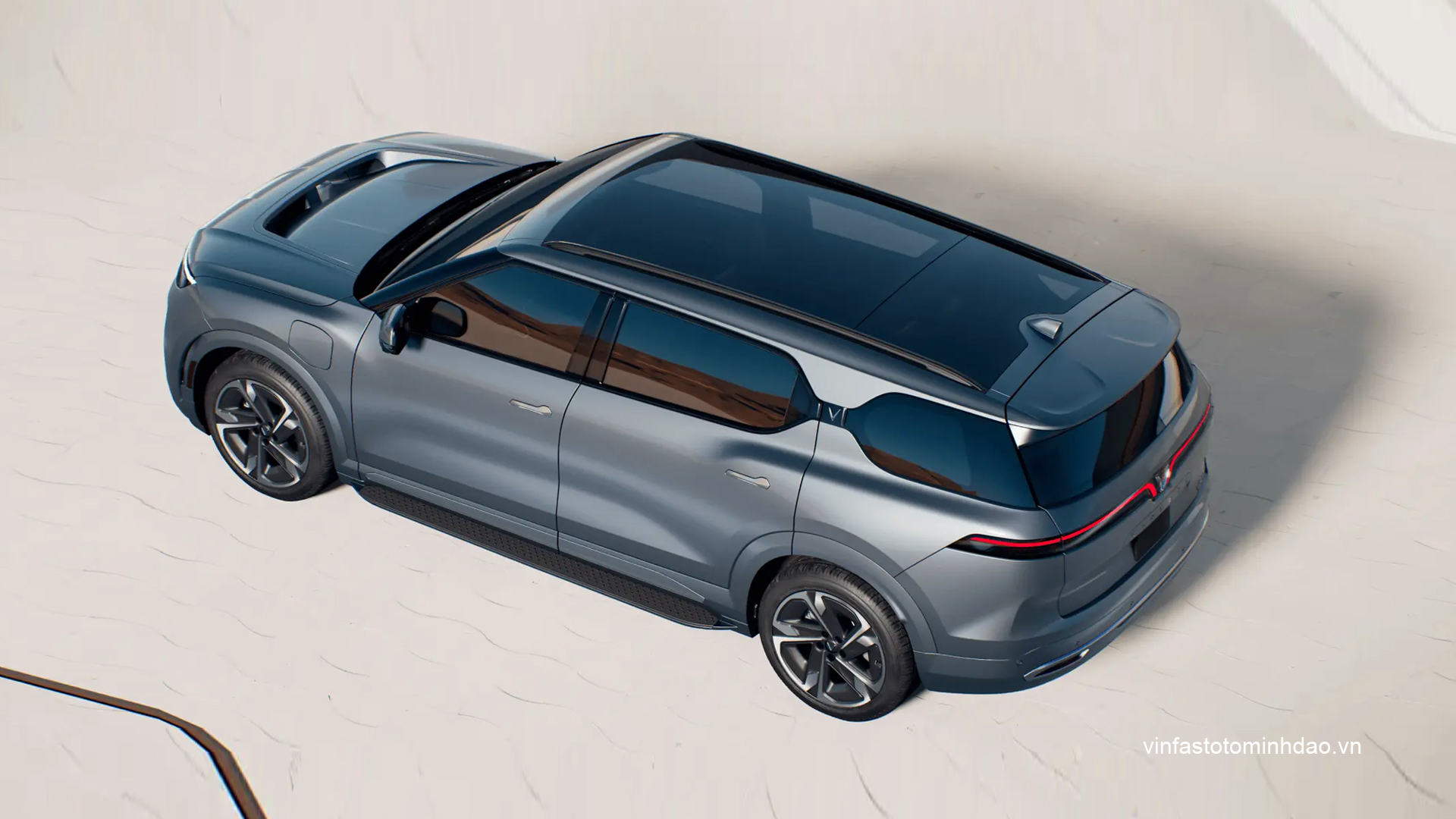 Điểm nhấn đặc biệt nằm ở thân xe với logo chữ “V” màu bạc nổi bật ở cột C làm tăng độ nhận diện thương hiệu VinFast. Thiết kế phần cản sau và cánh gió thể thao thể hiện sự mạnh mẽ, bề thế, khỏe khoắn trong ngoại hình của ô tô điện VF 9.